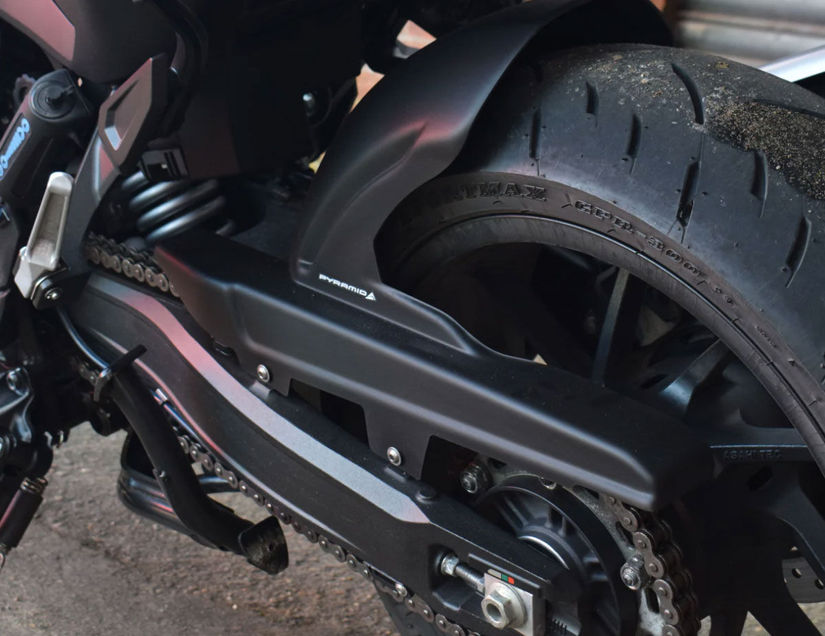 Pyramid Huggers are one of our signature designs, developed specifically for your motorcycle. They not only enhance the look of your bike but also provide excellent protection. Where possible, they include extended coverage below the swingarm and a built-in chainguard—offering full protection for your shock absorber and chain while replacing your existing guard.