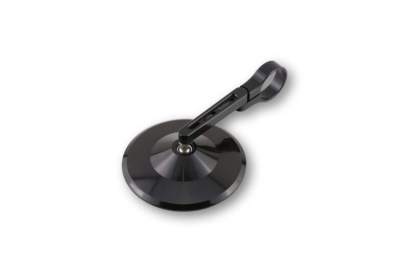 Universal handlebar end mirror, noble design, with a round head made of black anodized aluminum. In the second generation of the popular HIGHSIDER MONTANA handlebar end mirror, the mirror arm has been changed in length and shape. The mirror arm has three stylish air vents and is shorter than the first generation. A hinge on the clamp provides additional adjustment for better visibility.