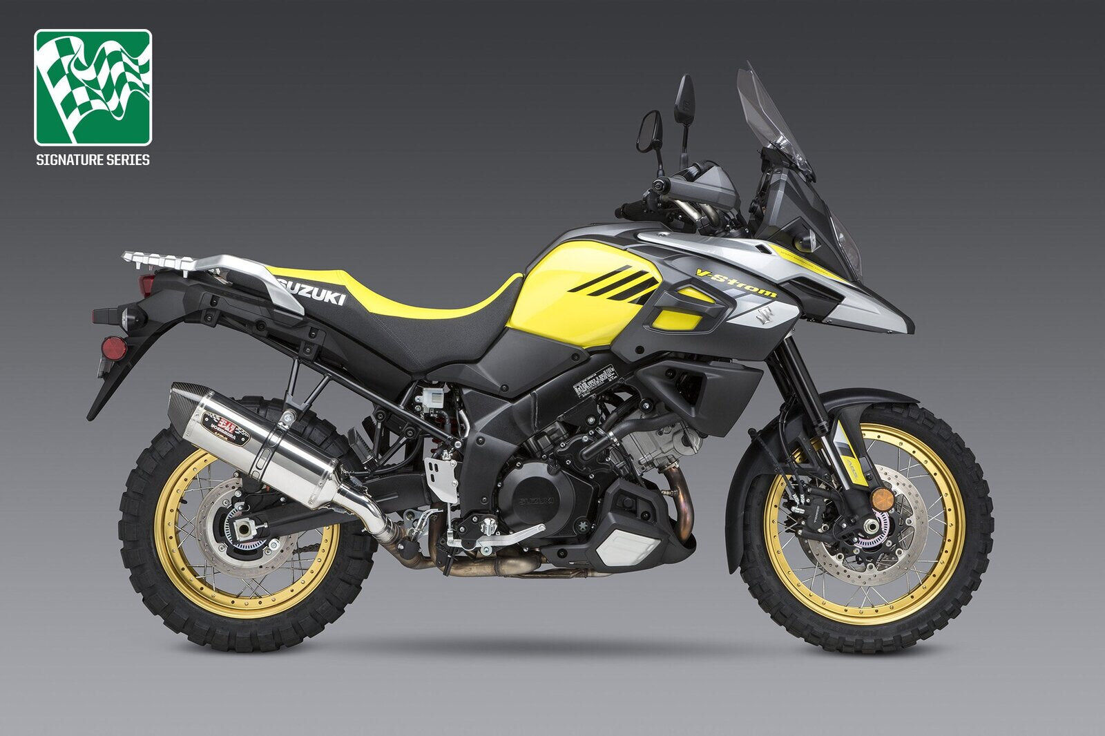 This is a Yoshimura V-STROM 1000 14-19 R-77 Stainless Slip-On Exhaust, w/ Stainless Muffler
