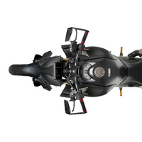 In the aerodynamic aspect, the new Naked front spoiler from Puig channels the air that reaches the radiator frontally and, thanks to its shapes, provides almost 2kg of downforce on the front wheel, generating, in turn, an anti-wheelie effect; anti-shimmie effect (greater stability at high speeds), more poise when braking and greater stability when changing direction.