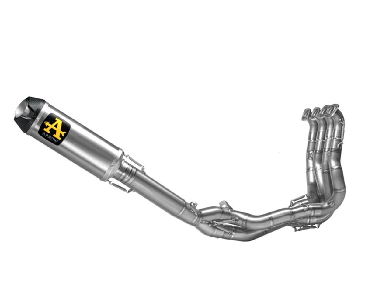The Arrow Indy Race Full System (71216CKZ) is a titanium racing exhaust designed for maximum performance on the Kawasaki ZX-10RR. Featuring a carbon end cap and included DB-Killer, this full titanium system eliminates the catalytic converter for improved flow and a deep racing tone.