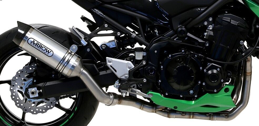 Arrow Headers Exhaust Approved Aluminium for Kawasaki Z 900 (2020–2024). Features a lightweight aluminium silencer with carbon fibre rear endcap, stainless steel internals, and stainless headers. Satinless steel clamp mounting ensures secure fitment. Omologato approved, delivering race performance with style and reliability.