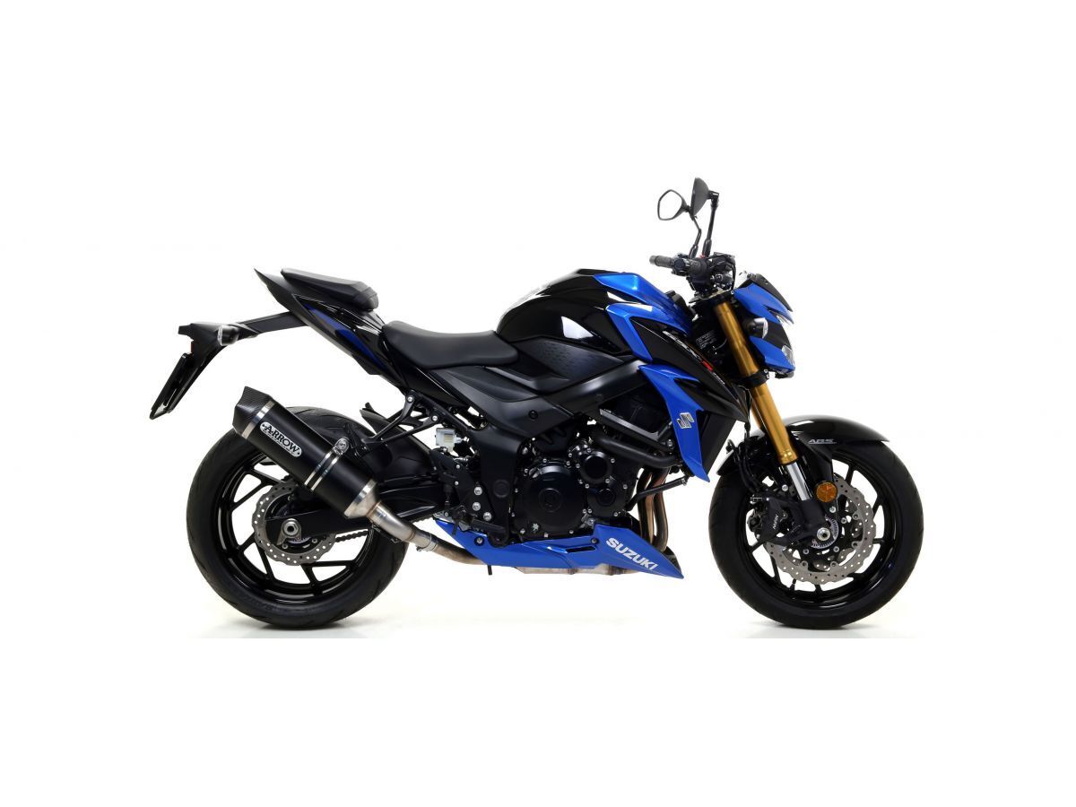 Arrow Full Exhaust Race-Tech Aluminium Black system for Suzuki GSX-S 750 (2017–2020). Complete Euro 4 approved system designed to maximise performance and reduce weight. Features stainless steel headers, mid-pipe, and a lightweight black aluminium silencer with carbon fibre end cap.