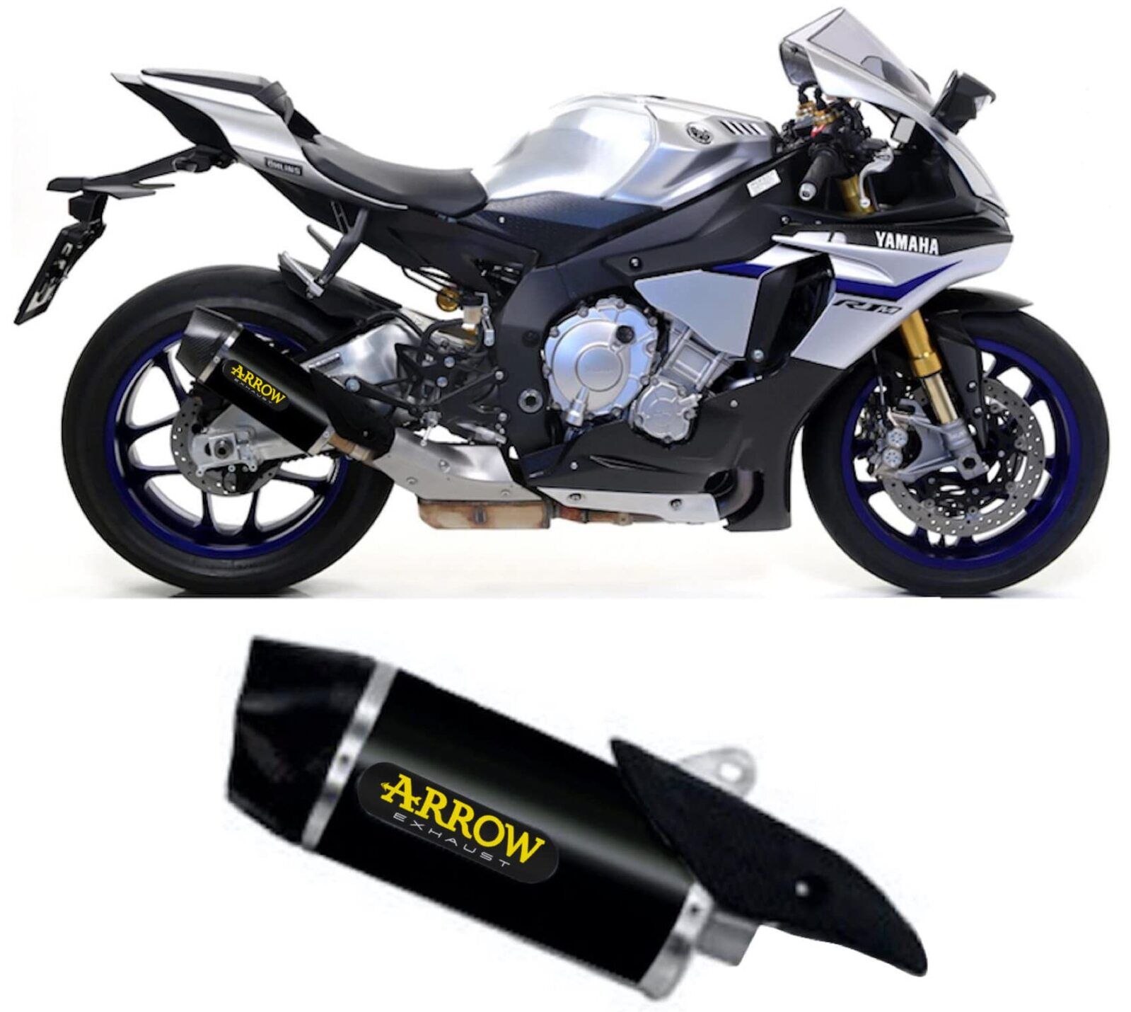 Arrow Indy Race Aluminium Dark exhaust for Yamaha YZF R1 2015–2016. Features a dark aluminium silencer with carbon fibre endcap, stainless internals, and welded mount. Race-inspired design with Euro E9 approval.