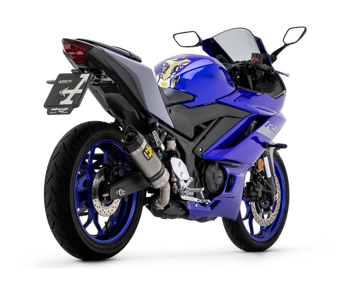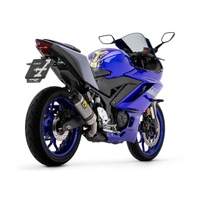 Arrow Thunder Titanium exhaust with carbon fibre end cap for Yamaha YZF R3 2021–2023. Lightweight titanium silencer paired with a carbon end cap delivers premium durability, sharper styling, and improved sound. Euro 5 approved and compatible with original collectors. Note: silencers are homologated without DB-Killer.