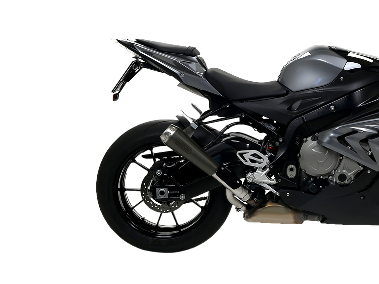 Arrow Pro-Race Steel Black Exhaust for BMW S 1000 RR (2017–2020). Constructed from durable dark stainless steel with a compact 250mm body, Euro 4 approved, and designed for performance with a welded mount and removable DB killer.