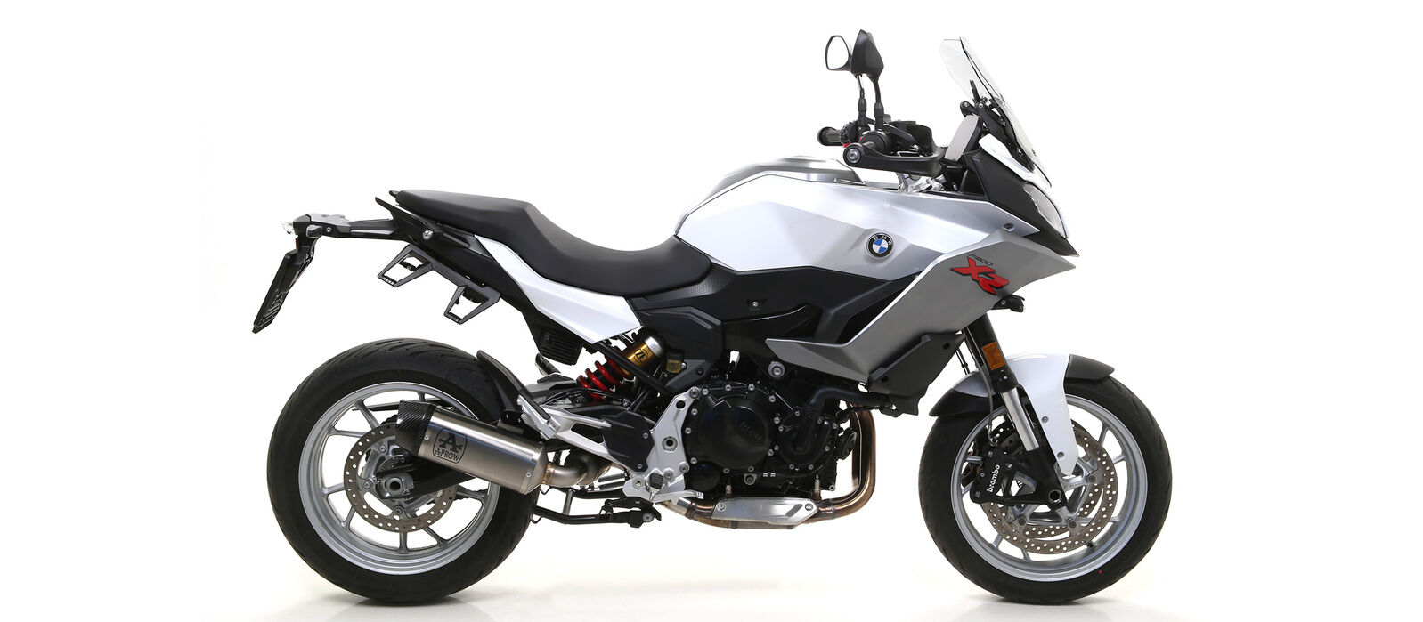 Arrow Indy Race Titanium full racing exhaust system with carbon fibre end cap for BMW F 900 XR 2020–2024. Complete system includes stainless steel headers, racing link pipe, and titanium slip-on muffler. Built for peak performance, aggressive styling, and maximum weight reduction with a sharp race-inspired tone. Racing use only.