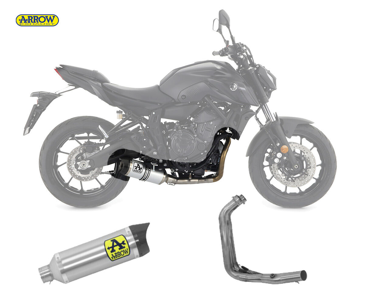Arrow Thunder full exhaust system in aluminium with carbon fibre end cap for Yamaha MT-07 2021–2024. Lightweight racing design without catalyzer, offering increased performance, sharper throttle response, and a sportier exhaust tone. Not approved for road use.