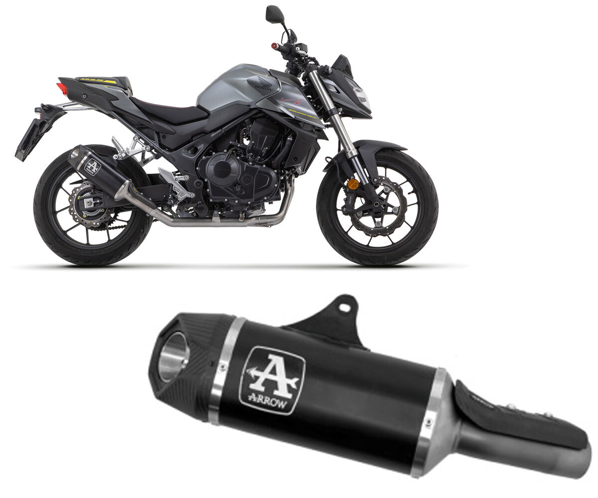 Arrow Indy-Race Dark Aluminium exhaust muffler with carbon fibre end cap for Honda CB 750 Hornet 2023–2024. Lightweight aluminium construction, Euro 5 approved, designed to fit OEM system.