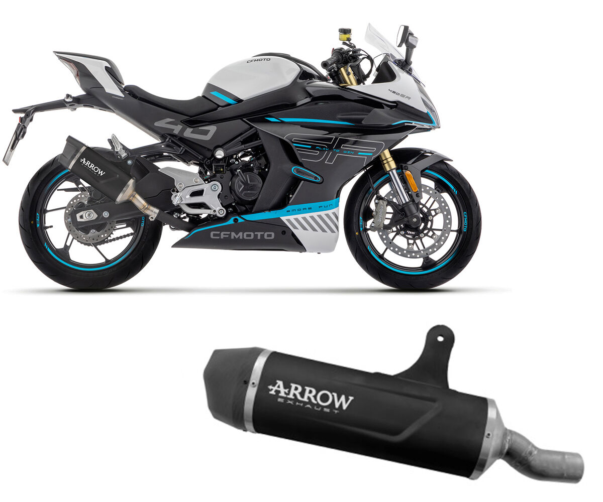Arrow Indy Race EVO exhaust muffler in dark aluminium with carbon end cap for CF MOTO 450NX/450SR 2023. Euro 5 approved and built for performance with a sleek racing look.