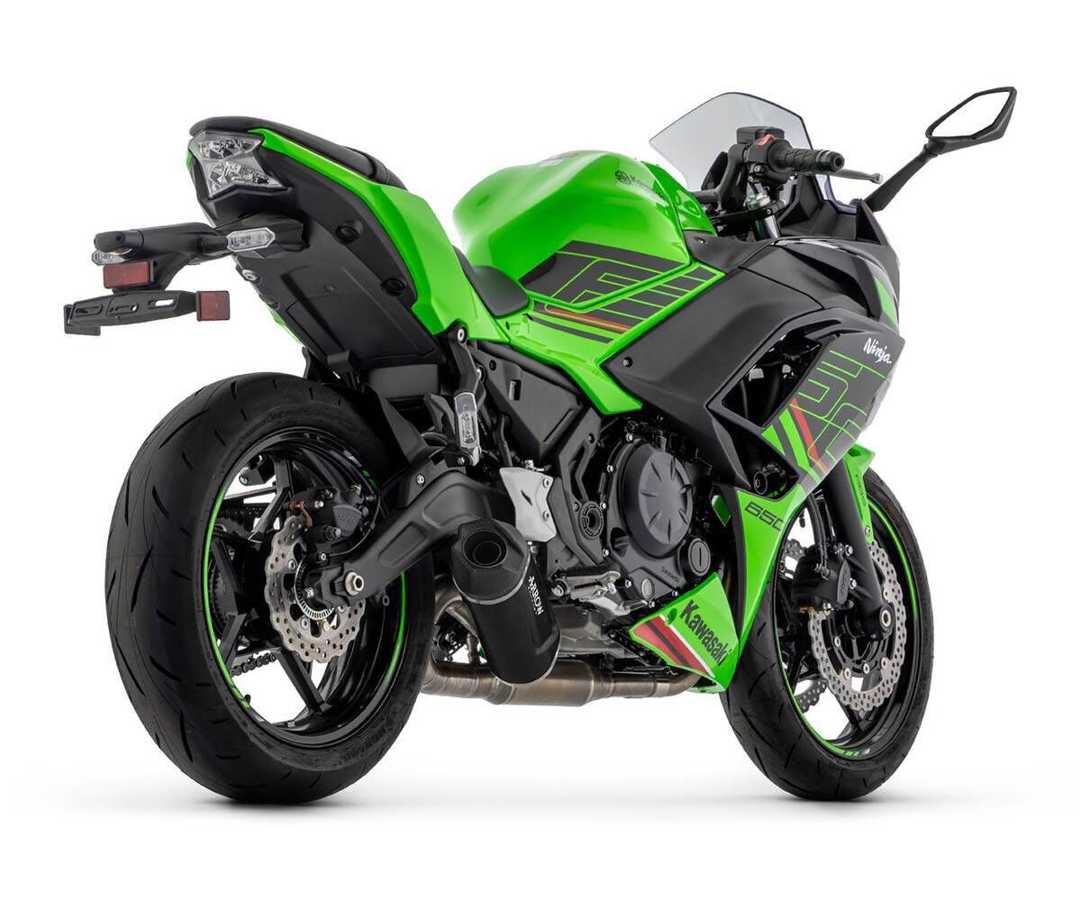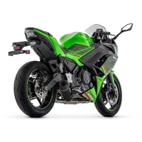 Arrow Indy Race EVO full system exhaust for Kawasaki Ninja 650 2024. Features a dark aluminium muffler with carbon end cap and stainless steel headers, Euro 5 approved.