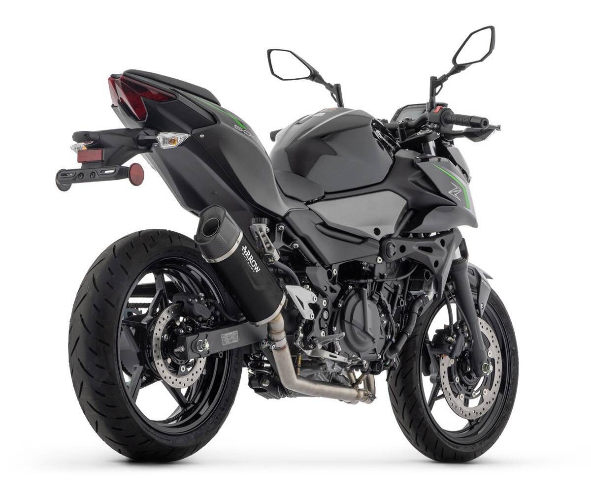 Arrow Indy Race EVO muffler for Kawasaki Z 500 2024. Crafted from dark aluminium with a carbon end cap, Euro 5 approved, designed to fit the OEM system while enhancing performance and sound.