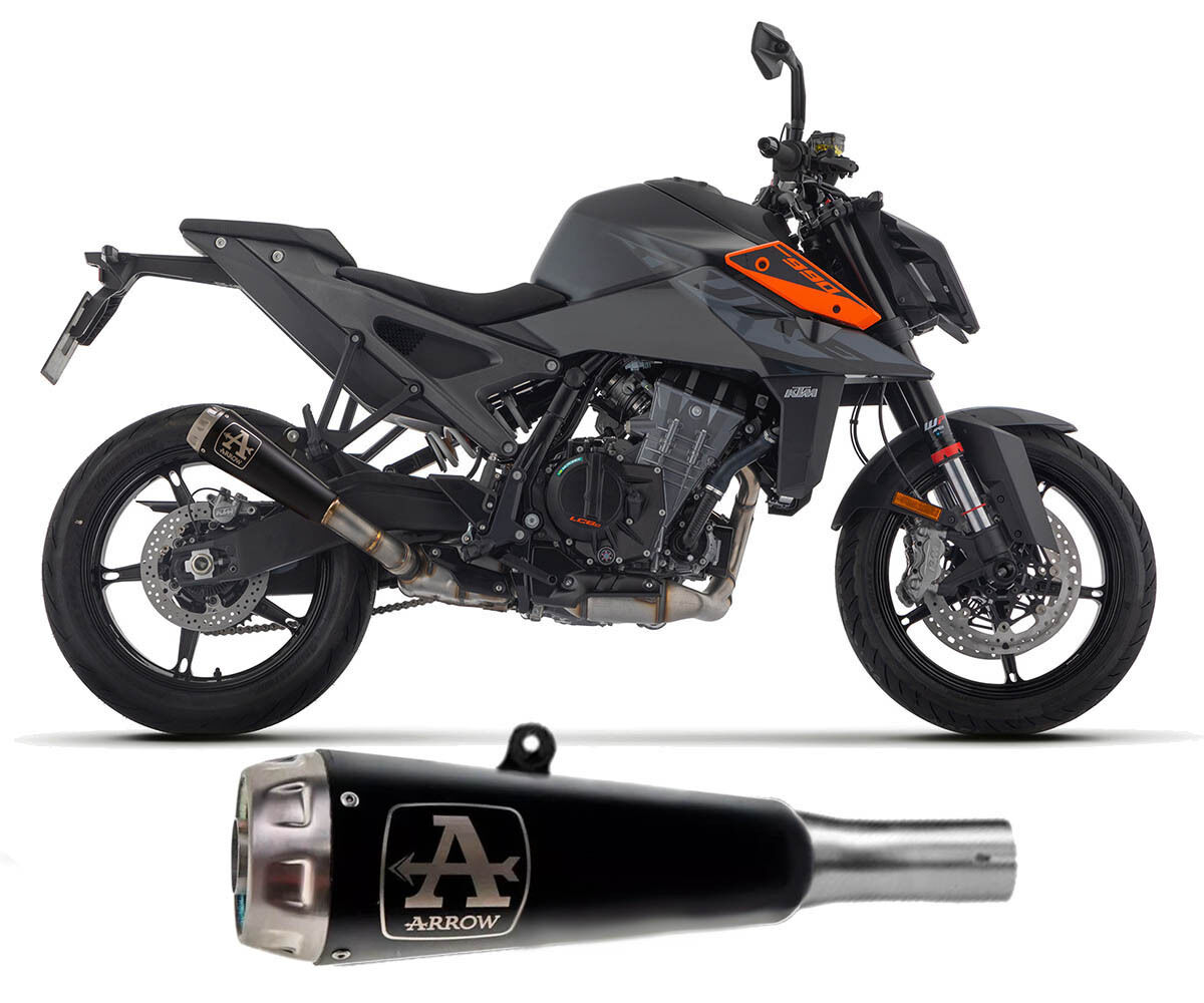Arrow Pro-Race Nichrom Dark exhaust muffler with steel end cap for KTM Duke 990 2024. Built to fit the original collectors, this Euro 5 and ECE approved muffler combines lightweight performance, durability, and a deep racing sound with a stylish dark Nichrom finish.