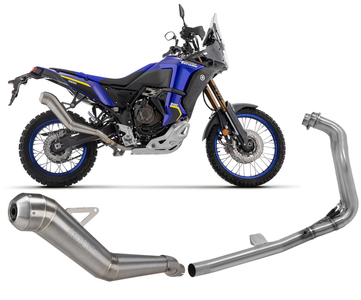 Arrow Dakar Replica Nichrom full system exhaust with titanium racing headers for Yamaha Tenere 700 2021–2024. Built to replicate Dakar Rally systems, this racing exhaust combines lightweight Nichrom with titanium headers for maximum durability, power, and performance. Strictly for racing use only.