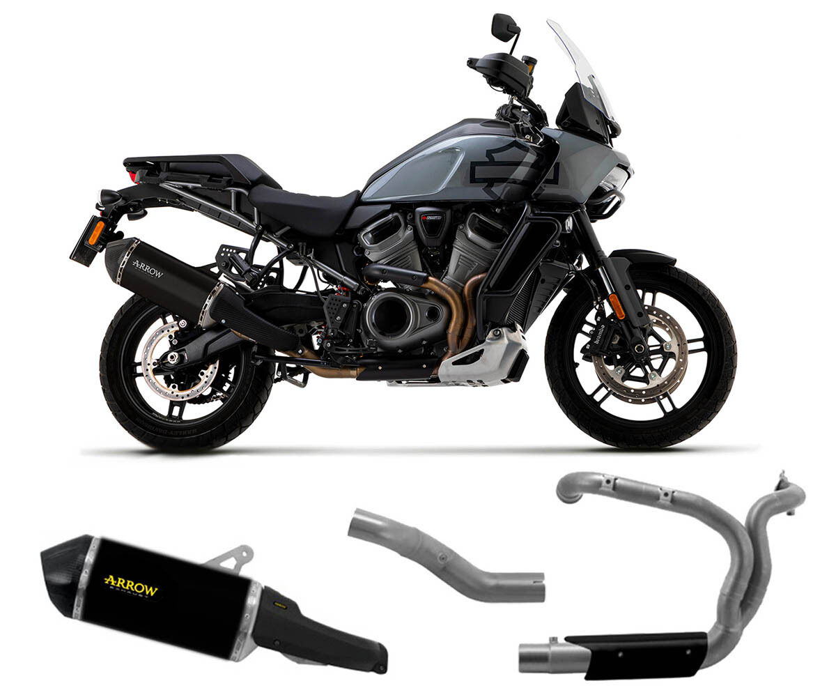 Arrow Sonora Dark Titanium full exhaust system for Harley-Davidson Pan America 1250 (2020–2023). This complete kit includes a Dark Titanium muffler with carbon fibre end cap, a non-catalytic central link pipe, and racing stainless steel headers. Built for maximum performance and an aggressive sound, the muffler itself is Euro 5 approved, while the headers and link pipe are racing-only.