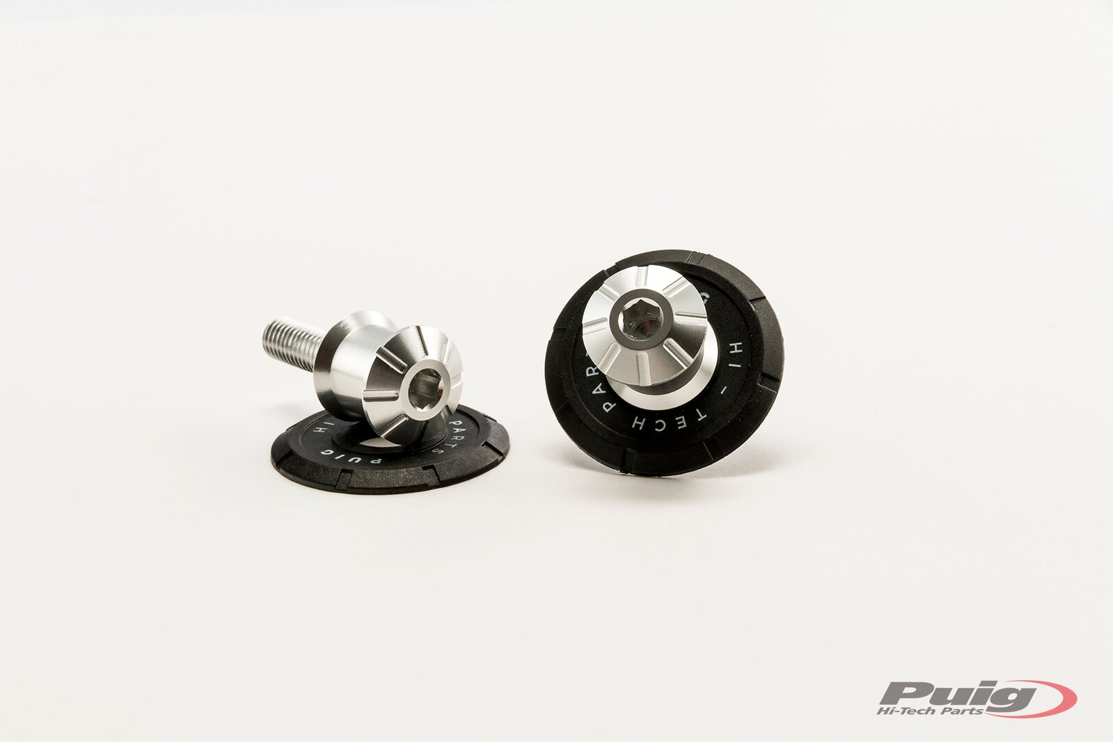 Manufactured from an anodized aluminium billet (reduced weight of 32 gr), it will guarantee the protection of the swingarm from possible scratches thanks to the fact that it comes with a black nylon washer thanks to the Puig Hi-Tech Parts etched on it.