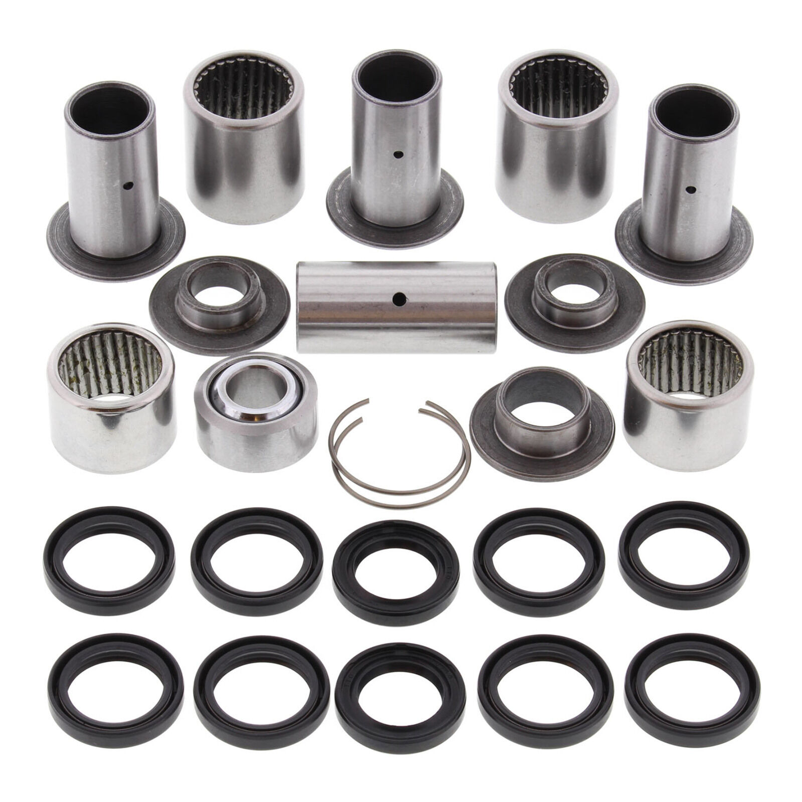 A Quality Suspension Linkage Kit from All Balls Racing. Kit includes lower shock bearing kit! Needle Bearings are made from 52100 bearing steel ARC61-65 heat treated ST13 steel shell. Bushings are case hardened and plated to prevent wear and corrosion. Shafts are made from 52100 Bearing steel through hardened and precision ground.