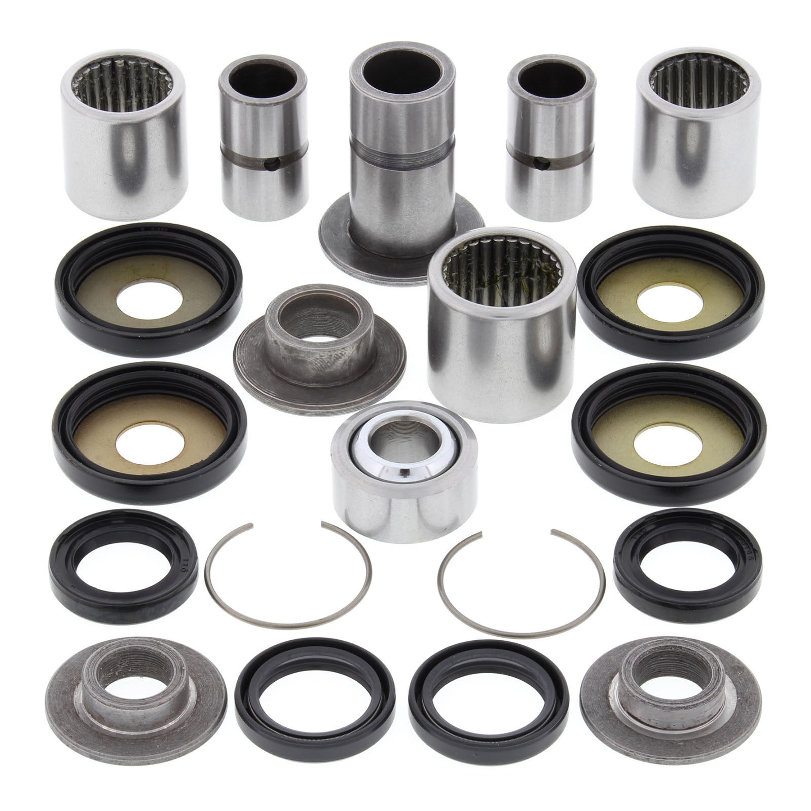 A Quality Suspension Linkage Kit from All Balls Racing. Kit includes lower shock bearing kit! Needle Bearings are made from 52100 bearing steel ARC61-65 heat treated ST13 steel shell. Bushings are case hardened and plated to prevent wear and corrosion. Shafts are made from 52100 Bearing steel through hardened and precision ground.