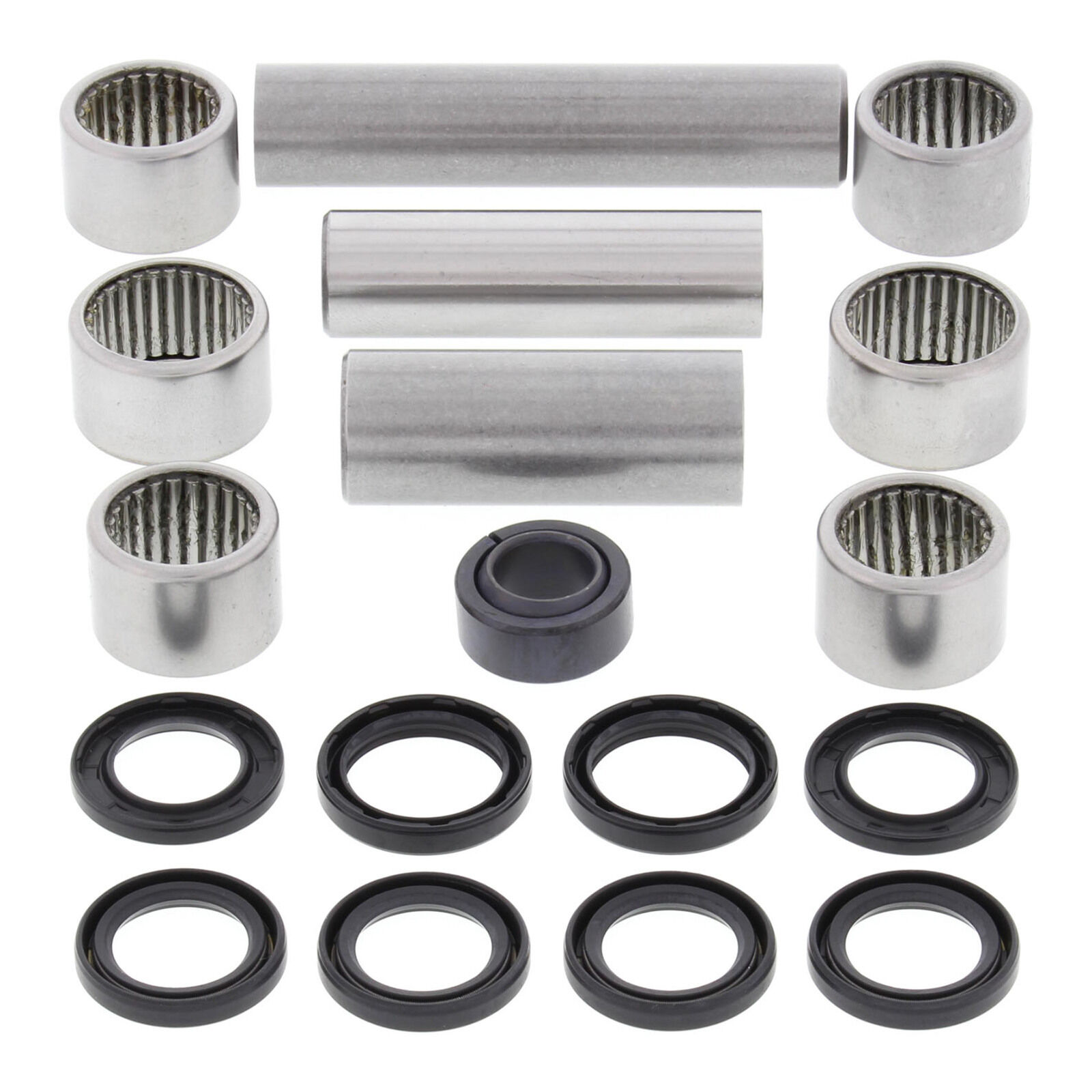 A Quality Suspension Linkage Kit from All Balls Racing. Kit includes lower shock bearing kit! Needle Bearings are made from 52100 bearing steel ARC61-65 heat treated ST13 steel shell. Bushings are case hardened and plated to prevent wear and corrosion. Shafts are made from 52100 Bearing steel through hardened and precision ground.