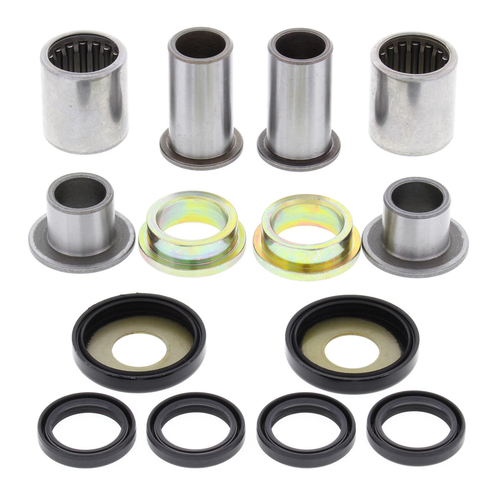 A Quality Swing Arm Repair Kit from All Balls Racing. Bushings are case hardened and plated to prevent wear and corrosion. POM composite washer bearings replace thrust needle washers for susperior resistance to water and dirt and increase service life. Shafts are made from 52100 Bearing steel through hardened and precision ground. Needle Bearings are made from 52100 bearing steel and ARC61-65 heat treated ST13 steel shell.