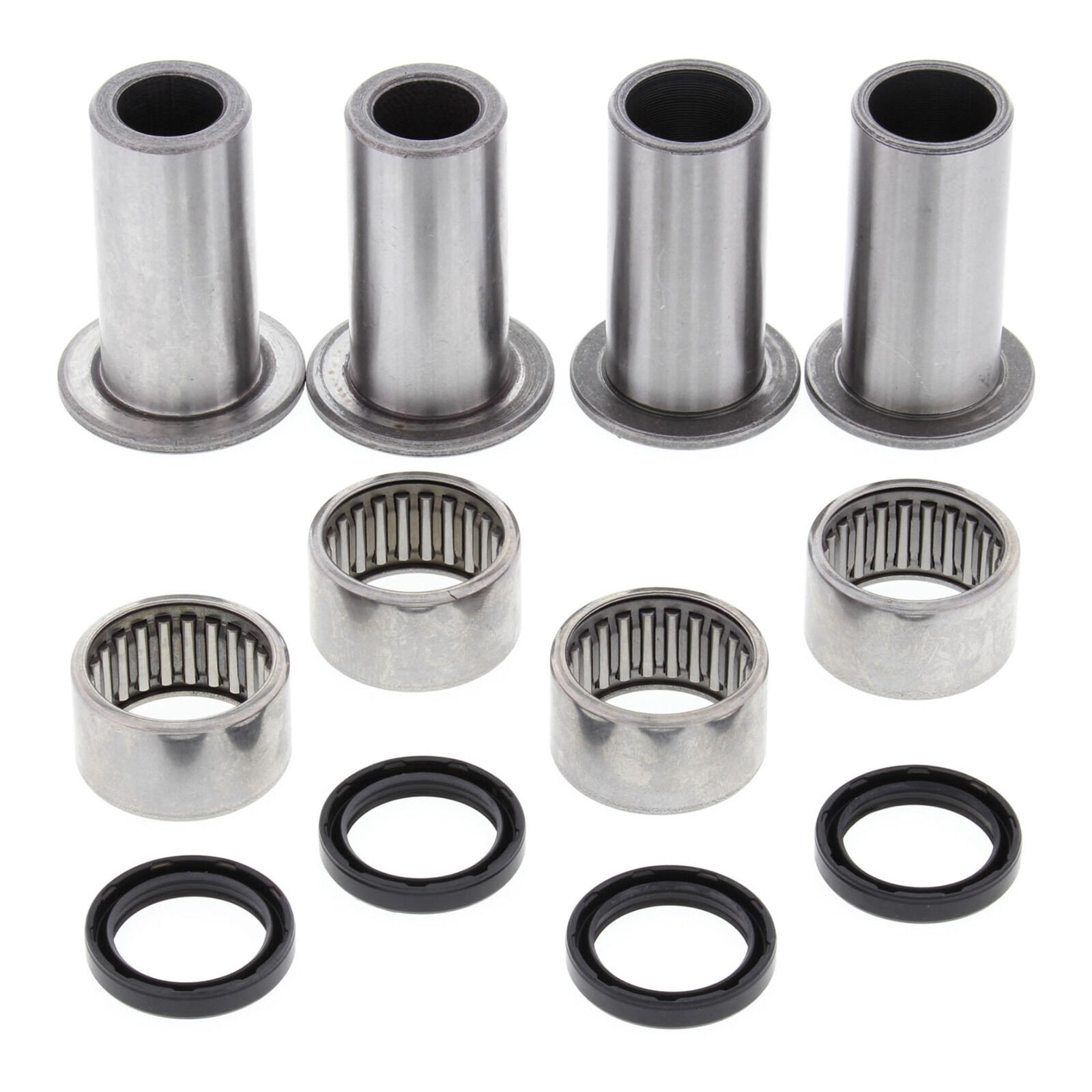 A Quality Swing Arm Repair Kit from All Balls Racing. Bushings are case hardened and plated to prevent wear and corrosion. POM composite washer bearings replace thrust needle washers for susperior resistance to water and dirt and increase service life. Shafts are made from 52100 Bearing steel through hardened and precision ground. Needle Bearings are made from 52100 bearing steel and ARC61-65 heat treated ST13 steel shell.
