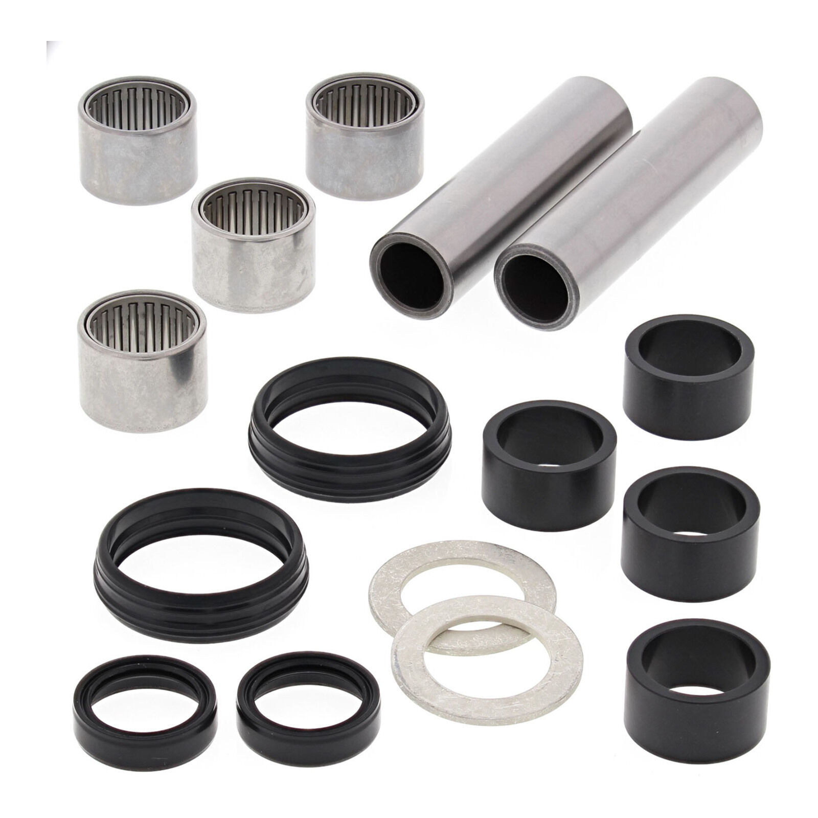 A Quality Swing Arm Repair Kit from All Balls Racing. Bushings are case hardened and plated to prevent wear and corrosion. POM composite washer bearings replace thrust needle washers for susperior resistance to water and dirt and increase service life. Shafts are made from 52100 Bearing steel through hardened and precision ground. Needle Bearings are made from 52100 bearing steel and ARC61-65 heat treated ST13 steel shell.