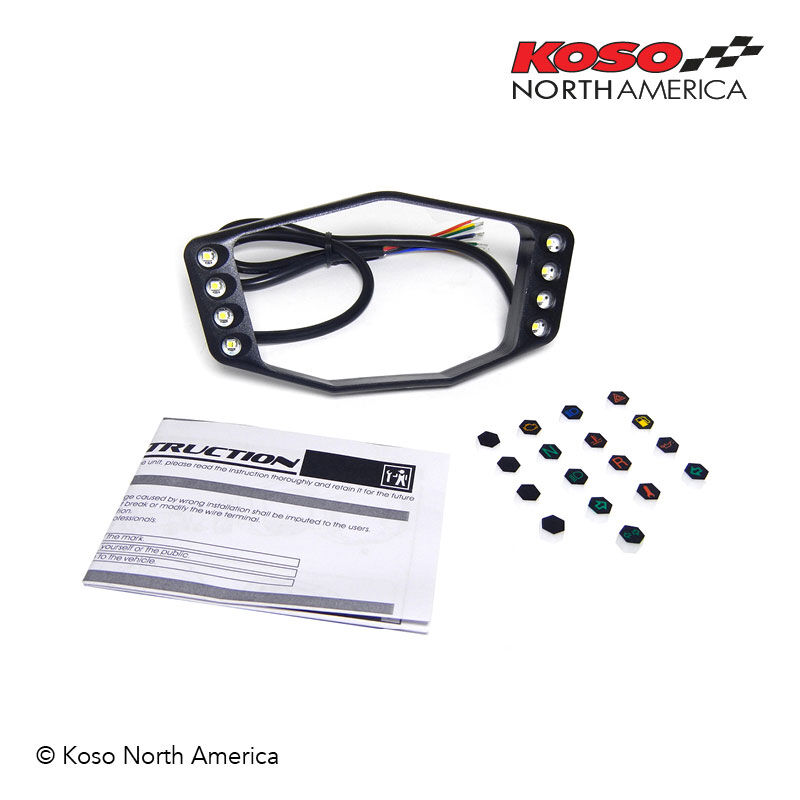 BRAND: Koso SKU: BA022000-WThis Plug-in Indicator Lights Kit was developed for the DB-02 & DB-02R meters. Unlike the other indicator lights kits on the market our model will allow you to build it according to your needs. 12 different symbols available to match your bike functions.