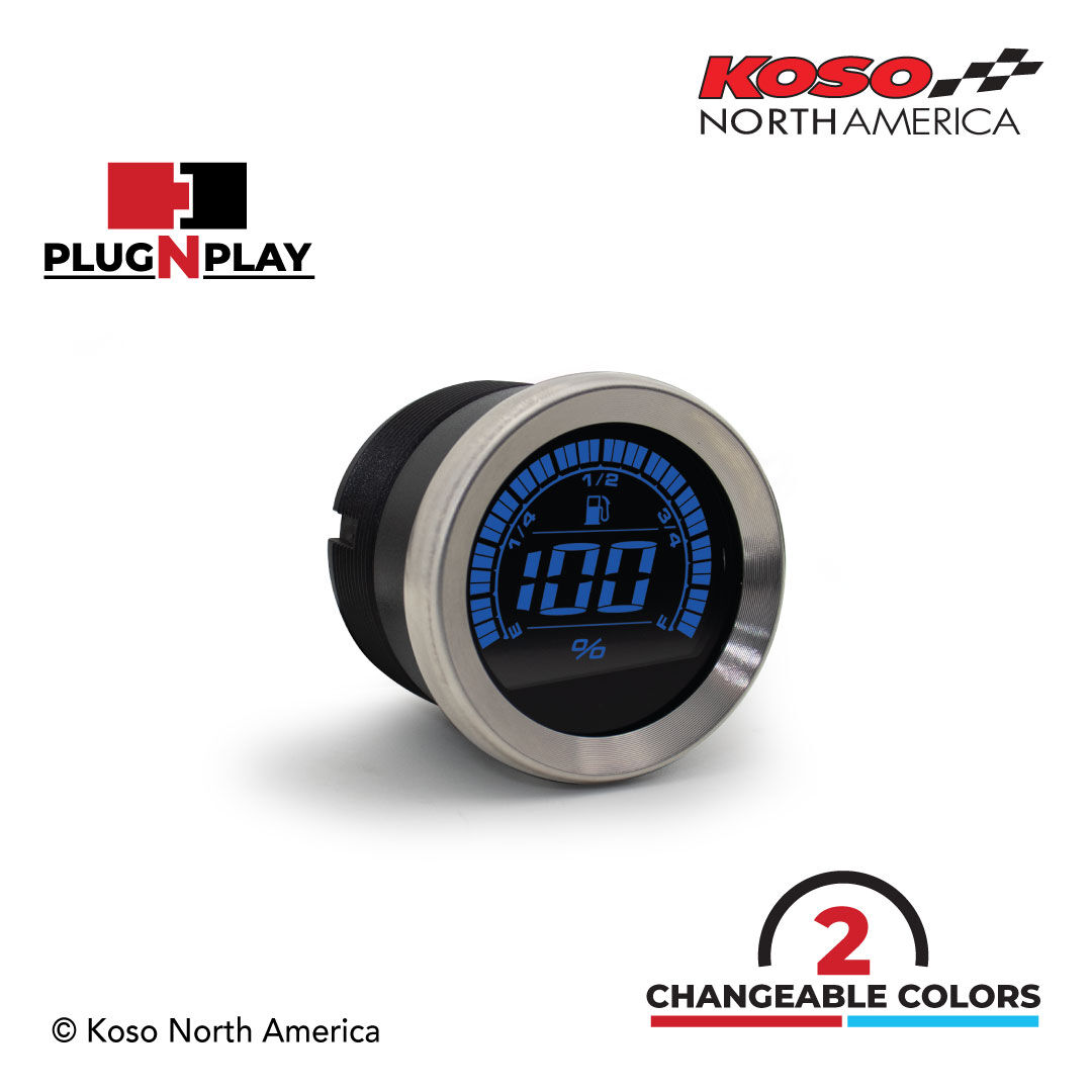 BRAND: Koso SKU: BA050200This plug & play fuel meter is equipped with a 2 color changeable LCD display. It will precisely display the percentage of fuel left in the tank.