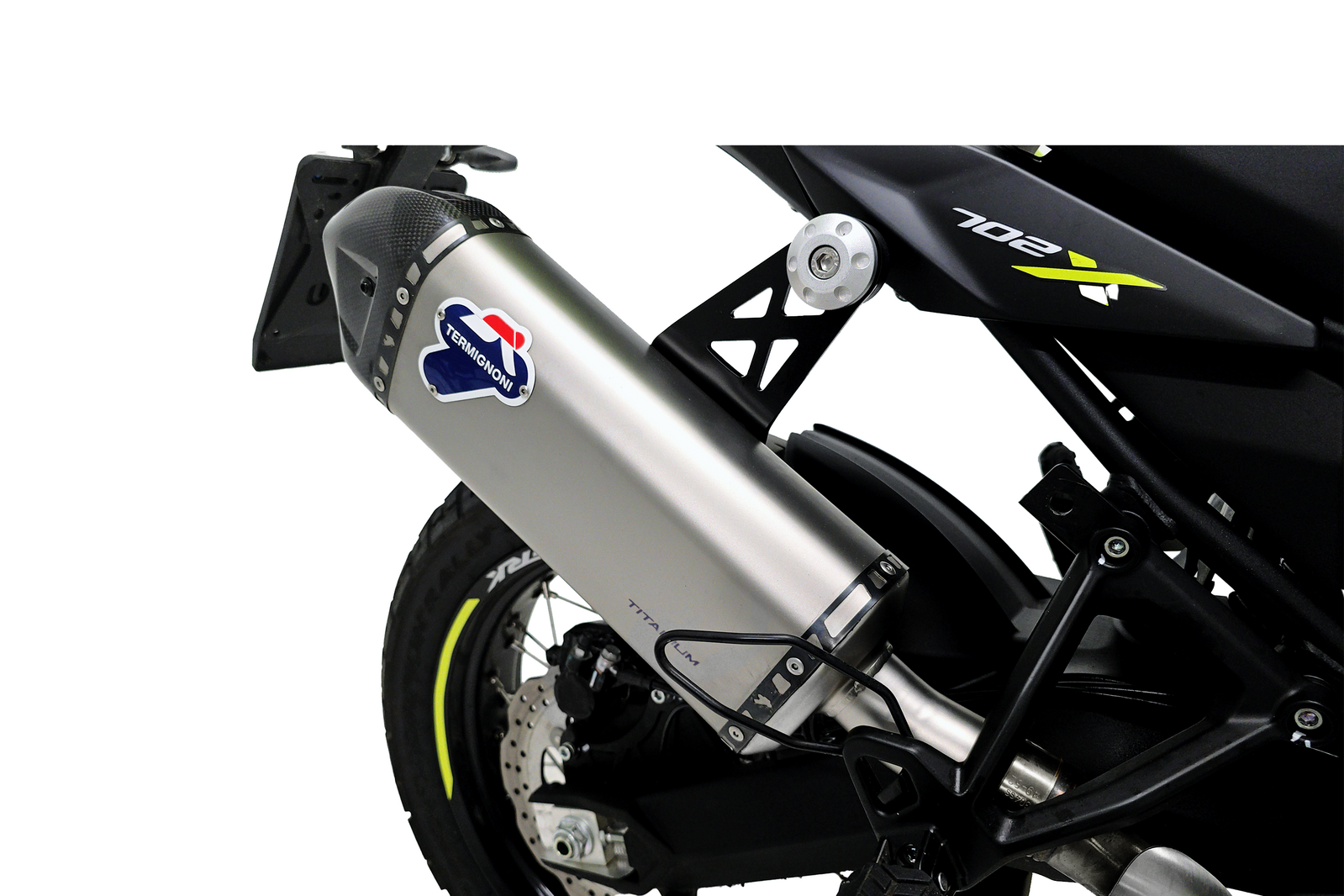 Built with a titanium sleeve and carbon-fiber end cap, the silencer is supported by a stainless-steel internal structure for durability and strength. Its lightweight construction improves handling and throttle response while delivering a resonant exhaust note that enhances the TRK 702’s adventure character.
