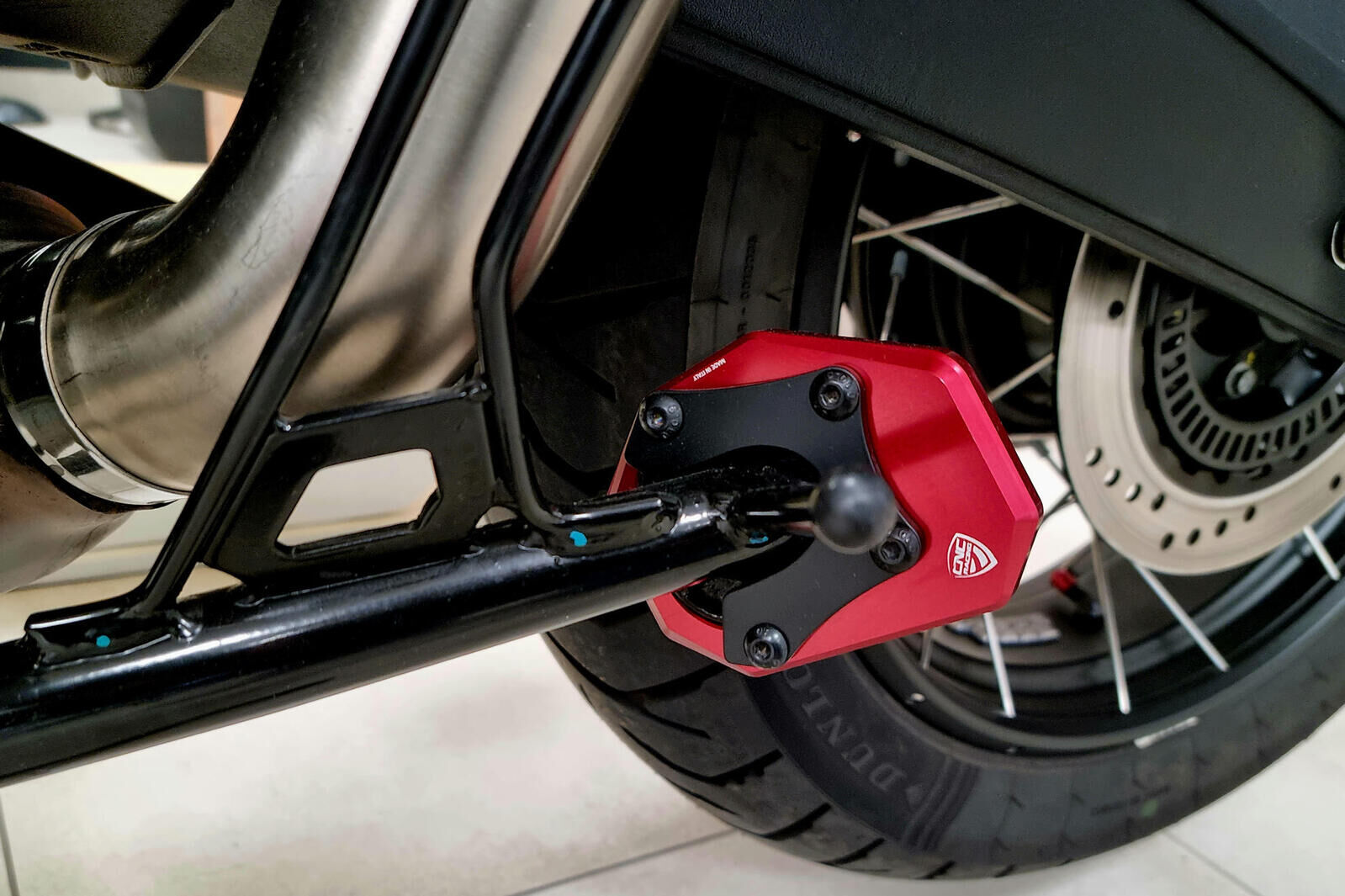 Side stand extension machined from light alloy billet and then given an anodized surface finish. Designed to provide the original kickstand with a larger surface to sit on for safer bike parking.The top bracket is made in S235JR steel to ensure maximum durability.Supplied already assembled with screws having a black galvanizing treatment to give aesthetic uniformity. Please check Specifications for model compatibility.Delivery note: At Sportsbike, we offer a wide range of high-quality products, many of which are sourced directly from Europe. We have stock both in Australia and shipped in directly from Europe. Therefore, please allow 1-3 weeks for delivery. This ensures we can provide the best selection and service for your specific needs. We will confirm the ETA of shipping within 24-48 hours of an order being placed. Thank you for your understanding and patience!