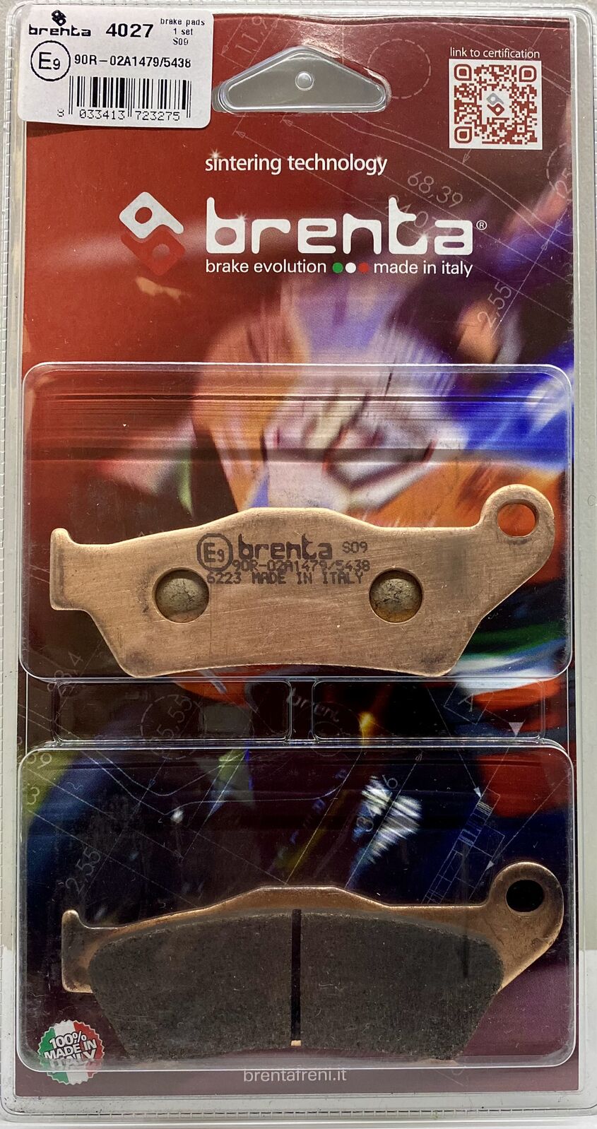 Brenta's sintered compound is copper-based and free of ferrous metals. Braking is very linear with a friction coefficient that fluctuates between 0.45 and 0.75 depending on the operating temperature and operating pressure. The ideal operating temperature is at around 200°C to 350°C. Braking has a linear bite (response to the first touch of the lever) and the performance is effective and progressive. It is not suitable for use on track with large displacement motorcycles. This product is ECE R90 approved.