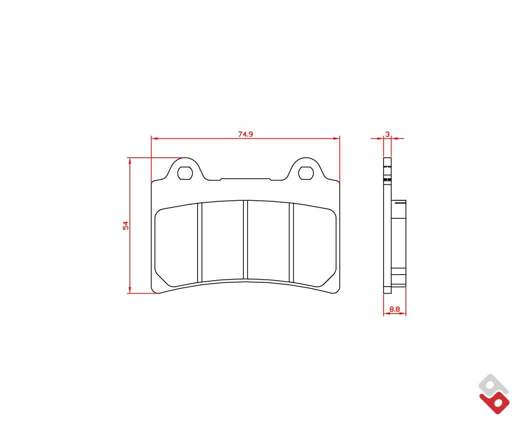 Brenta's sintered compound is copper-based and free of ferrous metals. Braking is very linear with a friction coefficient that fluctuates between 0.45 and 0.75 depending on the operating temperature and operating pressure. The ideal operating temperature is at around 200°C to 350°C. Braking has a linear bite (response to the first touch of the lever) and the performance is effective and progressive. It is not suitable for use on track with large displacement motorcycles. This product is ECE R90 approved.