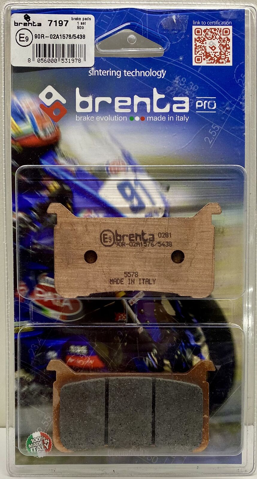 Brenta motorcycle brake pads - sintered PRO compound. This compound is specific for road and track use. The nickel-based mixture allows for excellent performance and resistance to stress. The first bite is more responsive than the sintered Series 4. The friction coefficient is between 0.5 and 0.8. The ideal operating temperature is between 200°C and 400°C. This product is ECE R90 approved.