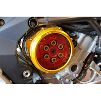 Clear oil bath clutch cover designed for MV Agusta 3-cylinder models. Machined from solid light alloy billet and finished with anodizing for durability, strength, and premium styling.