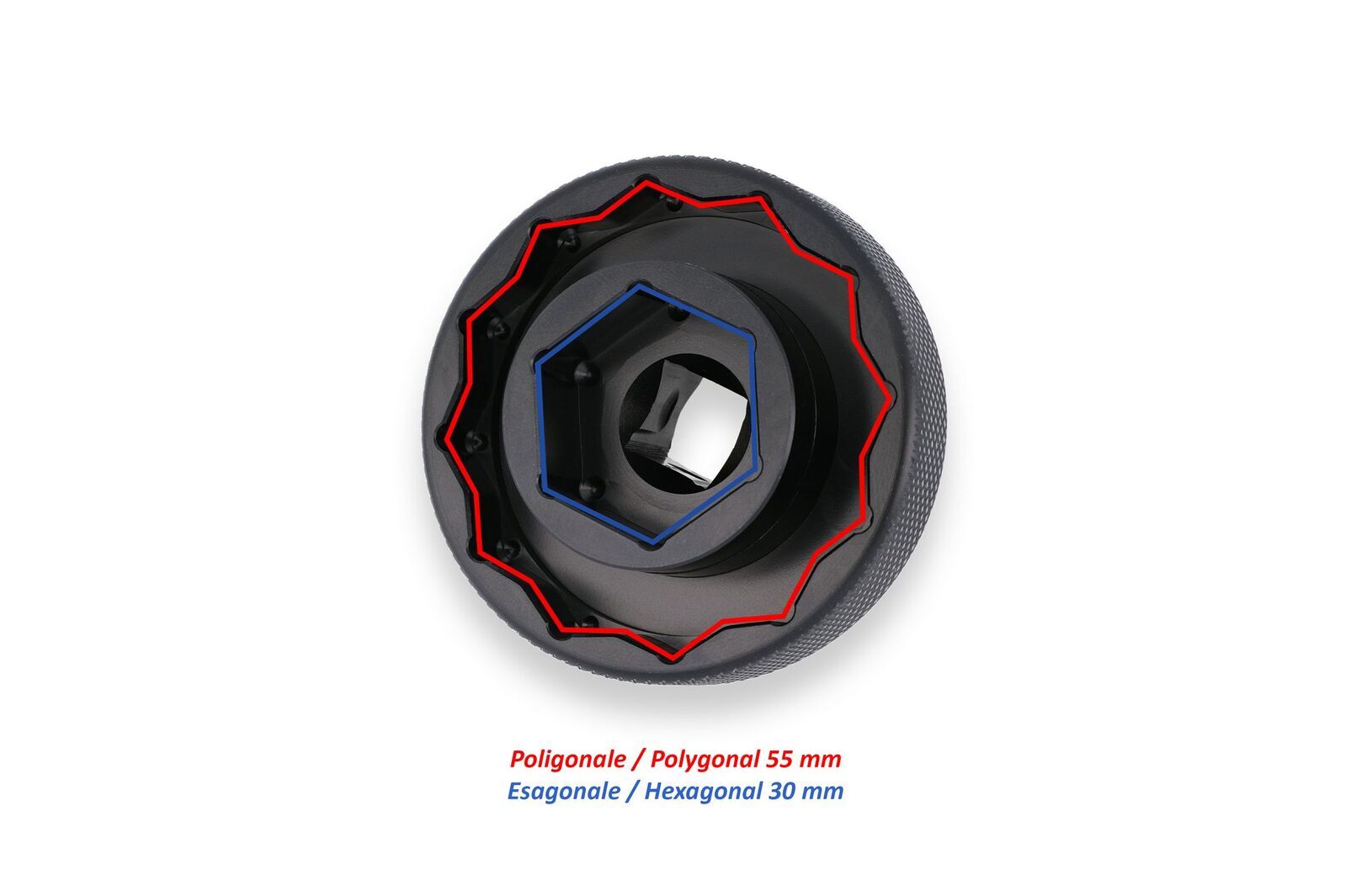 Two-in-one socket drive tool designed for the front (hex 30 mm) and rear (polygonal 55 mm) wheel nuts. Precision-engineered to ensure a perfect fit and reliable torque application, this tool features a 1/2” female drive for use with a standard hand torque wrench. Ideal for workshop and garage use, it offers strength, accuracy, and convenience in a compact design.