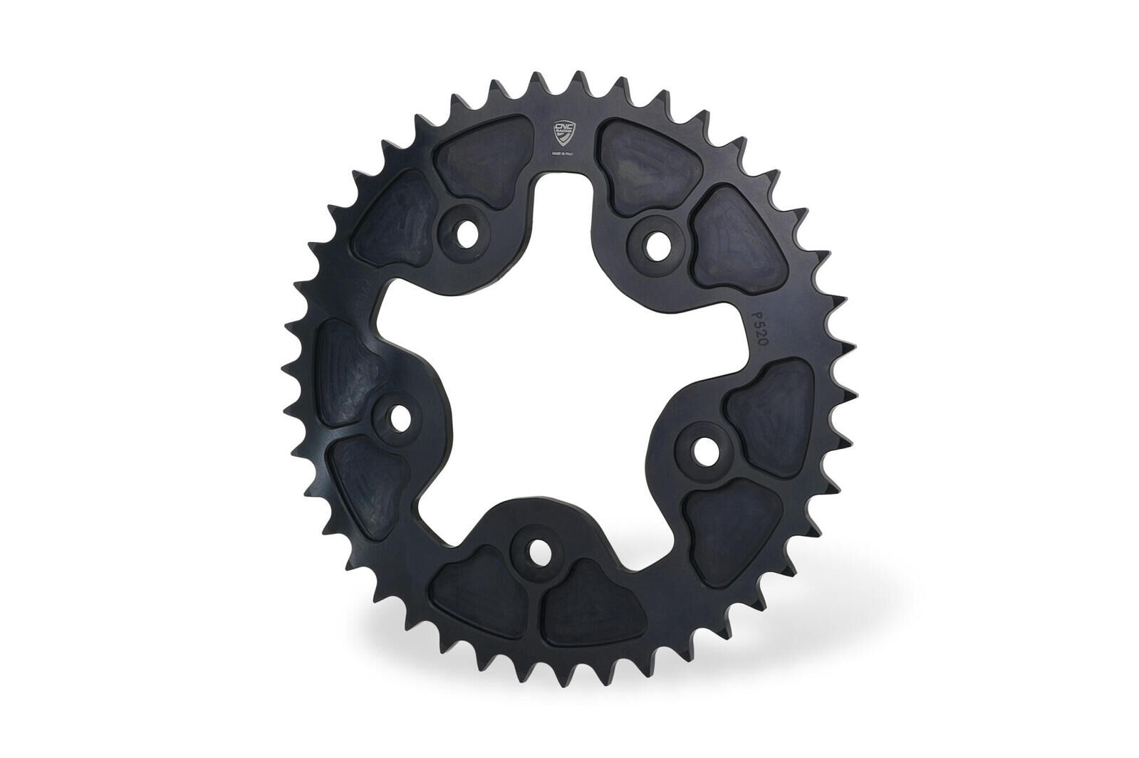 Ring gear T46 P520, CNC-machined from solid Ergal billet aluminum and treated with a hard anodized finish for exceptional strength, precision, and corrosion resistance. Designed for both street and racing applications, this lightweight yet durable sprocket ensures efficient power transfer and long-lasting performance.