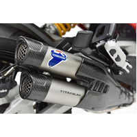 SLIP-ON SYSTEM EXHAUST TERMIGNONI D210 - DUCATI MULTISTRADA V4 - D21008040ITCHOMOLOGATEDTermignoni presents the EU5 homologated silencer kit dedicated to DUCATI MULTISTRADA V4TECHNICAL SPECIFICATIONS STEEL SILENCER KIT CODE: D21008040ITCSteel silencer interior, steel “Y”link pipe, titanium sleeve, carbon end cap and heat shield. Black anodised aluminium brackets.PRODUCT PERFORMANCE CHARACTERISTICSPower [Cv], Delta vs a OEM:Pmax: 0,5Cv@11400rpm – MAX Gain: 2,49Cv@8800rpmTorque [Nm], Delta vs a OEM:Cmax: 0,3Nm@7600rpm – Max Gain: 2,37Nm@5900rpmWeight compared:Exhaust OEM: 2850g.Exhaust TERMIGNONI:– 2400g nella versione -450g
