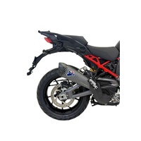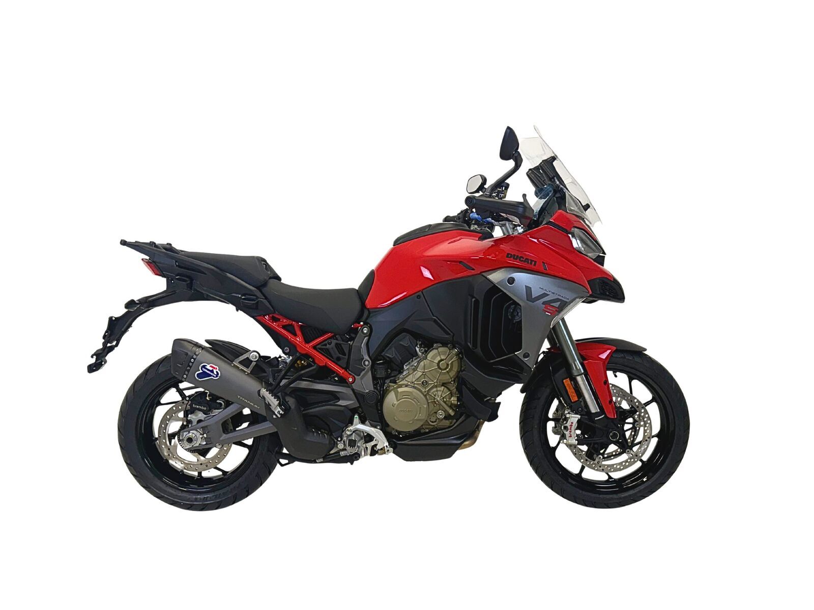 Termignoni presents an EU5+ approved silencer kit dedicated to the DUCATI MULTISTRADA V4 (MY 2025). Steel muffler interior, steel inlet and bulkhead, titanium sleeve, tungsten gray color, carbon end cap and dedicated heat shield. Aluminum brackets. WEIGHT Weight difference compared to OEM -1.3 kg POWER [HP], Delta vs OEM MAX Gain 2.5 HP @ 7500 rpm Pmax 2HP @ 10800rpm TORQUE [Nm], Delta vs OEM Max Gain 1.3Nm@7500rpm Cmax 0.7Nm@10800rpm MATERIAL MATERIAL Titanium, Carbon