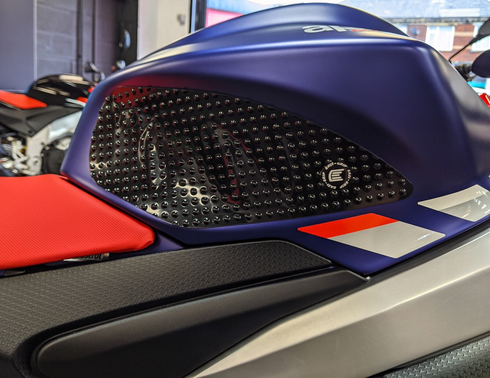 BRAND: Eazi-Grip SKU: EVO009BLEazi-Grip EVO - the non-abrasive high traction tank grips Aprilia RS660 / Tuono 660 EVO Tank Grips includes Tank Grips, left and right side, black IPA cleaner Fitting Instructions Manufactured in the UK from high quality polyurethane, these traction pads are expertly designed to be applied to the fuel tank recesses next to the riders knees and come pre-cut to size..