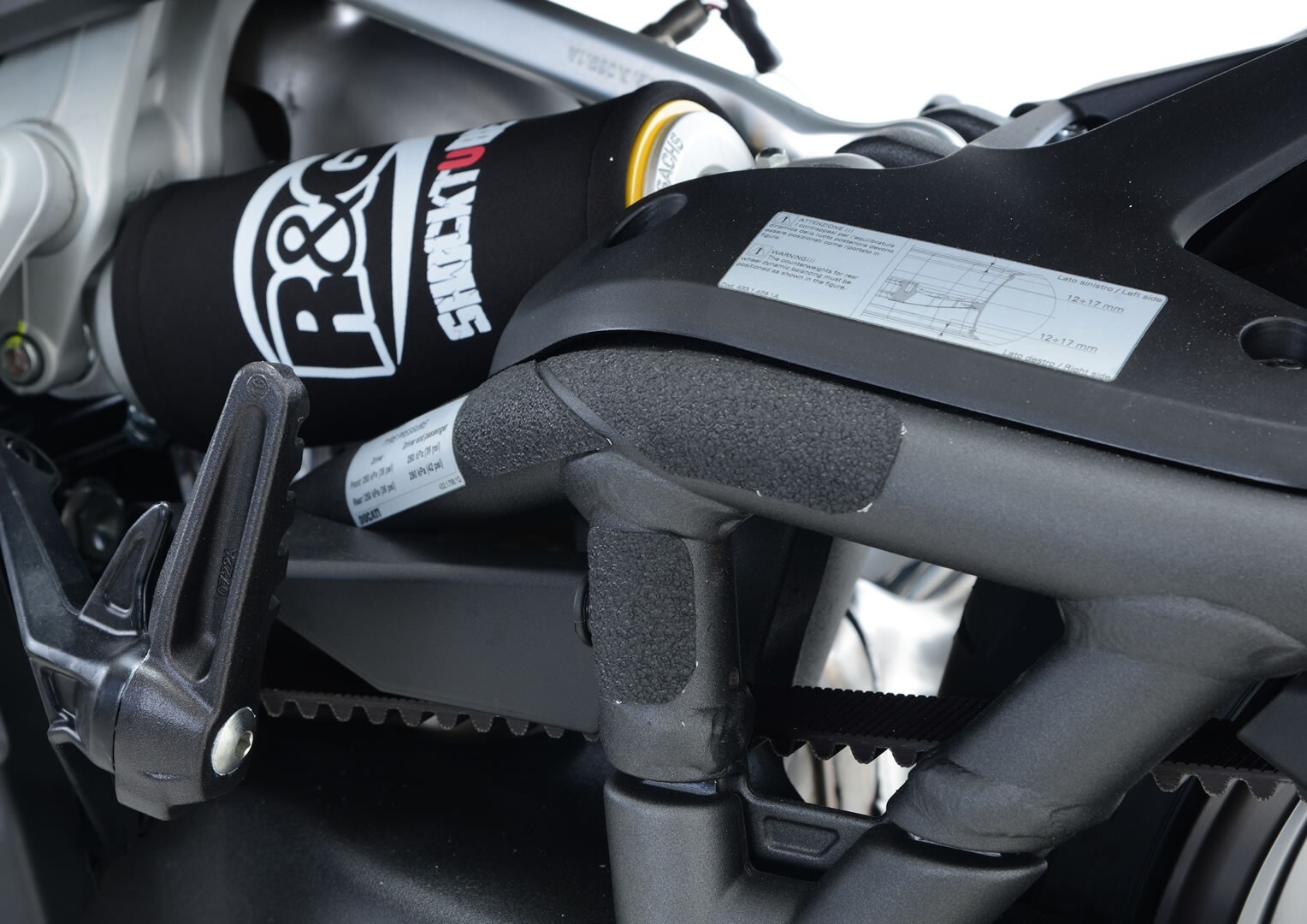 The unique R&G texture was specifically designed to be durable, providing the rider with a buffer between his boot on the exposed areas of the swingarm which can (on occasion) come into contact with each other during cornering causing wear and unwanted damage to the swingarm or boots (both expensive to fix!).