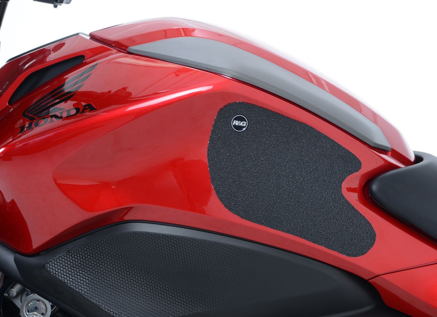 The unique R&G traction grip texture was specifically designed to be both soft and durable, providing the rider with the grip and feel he/she needs to assist in better bike control, enabling the rider to maintain a stable body position while cornering and braking, whilst also relieving fatigue and providing the rider with complete confidence allowing him/her to fully focus on the road (or track) ahead instead of slipping and sliding on the tank.