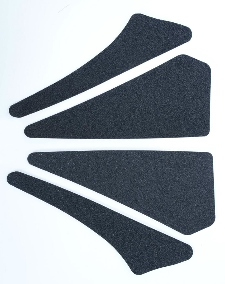Each tank traction grip kit is supplied with precision pre-cut adhesive pieces, designed to fit the intended bike, typically in either 2, 4 or 6 pieces (in total) depending on the shape of the tank and adjoining fairing.
