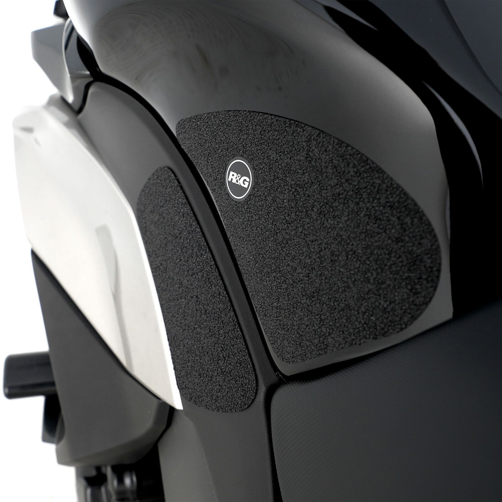 The unique R&G tank traction grip texture was specifically designed to be both soft and durable, providing the rider with the grip and feel he/she needs to assist in better bike control, enabling the rider to maintain a stable body position while cornering and braking, whilst also relieving fatigue and providing the rider with complete confidence allowing him/her to fully focus on the road (or track) ahead instead of slipping and sliding on the tank.
