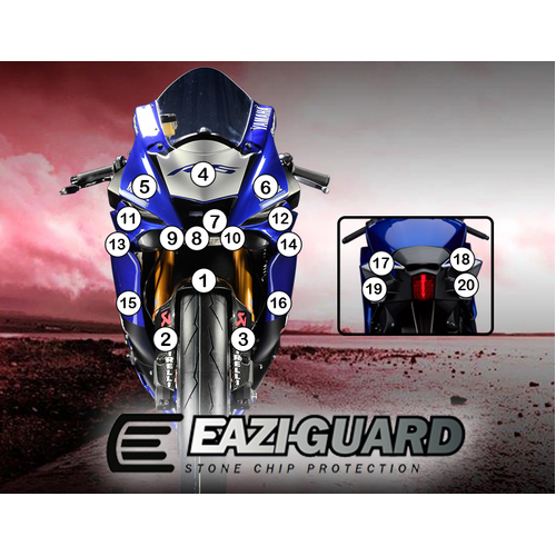 BRAND: Eazi-Grip SKU: GUARDYAM008MRace Developed Stone Chip Paint Protection from Eazi-Guard Yamaha YZF-R6 Stone Chip Paint Protection, matte includes Pre-cut stone Chip Paint Protection film Application solution Application tool Fitting Instructions Eazi-Guard stone chip protection tape is an Ultra-Thin, Ultra-Tough, polyurethane protection film, expertly designed to protect your bike and virtually eliminate damage..