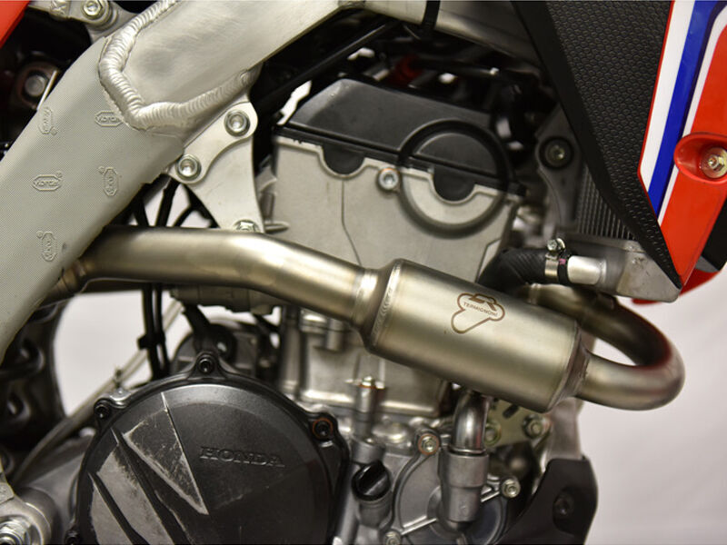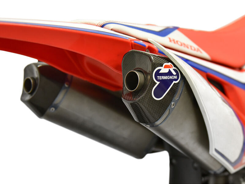 Supported vehicles: HONDA CRF 250 R 2018-2021 FULL KIT: H17009400ITC The full system kit includes two direct “Two and Two” collectors in stainless steel, with logo Termignoni lasered on both sides. Features: - Headers Material: Stainless Steel - Endcap Material: Carbon - Sleeve Material: Titanium - Thermoresistant Sticker Logo A Termignoni silencer is a high-performance aftermarket exhaust component typically used on motorcycles, designed to enhance the bike's sound, performance, and aesthetic appeal. Termignoni is an Italian brand renowned for its high-quality exhaust systems, and their silencers are often featured in racing and performance applications. Key Features of a Termignoni Silencer: - Sound Quality: One of the standout features of Termignoni silencers is the distinctive and deep sound they produce. They are engineered to amplify the exhaust note while ensuring compliance with noise regulations, depending on the model and application. - Material Construction: Termignoni silencers are usually made from high-end materials like titanium, carbon fiber, and stainless steel. These materials are lightweight and durable, improving both the performance and the appearance of the motorcycle. - Performance: Termignoni exhaust systems, including their silencers, are designed to optimize exhaust flow, which can lead to increased horsepower and torque. This is particularly beneficial for riders who seek improved engine performance in both street and track conditions. - Design: Termignoni silencers are often sleek and stylish, with a focus on aesthetics that align with the high-performance motorcycle culture. Their design complements various motorcycle brands, including Ducati, Aprilia, and other premium performance bikes. - Racing and Street Models: Termignoni manufactures exhaust components for both racing and street applications. Racing models often feature lighter materials and more aggressive designs, while street models balance performance with noise regulation compliance for everyday use. - Tunability: In some cases, Termignoni offers full exhaust systems (not just the silencers) that are tuned for specific motorcycles, allowing for more precise adjustments to the exhaust flow, leading to better engine responsiveness and overall power output.