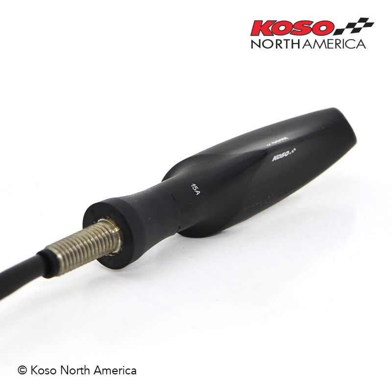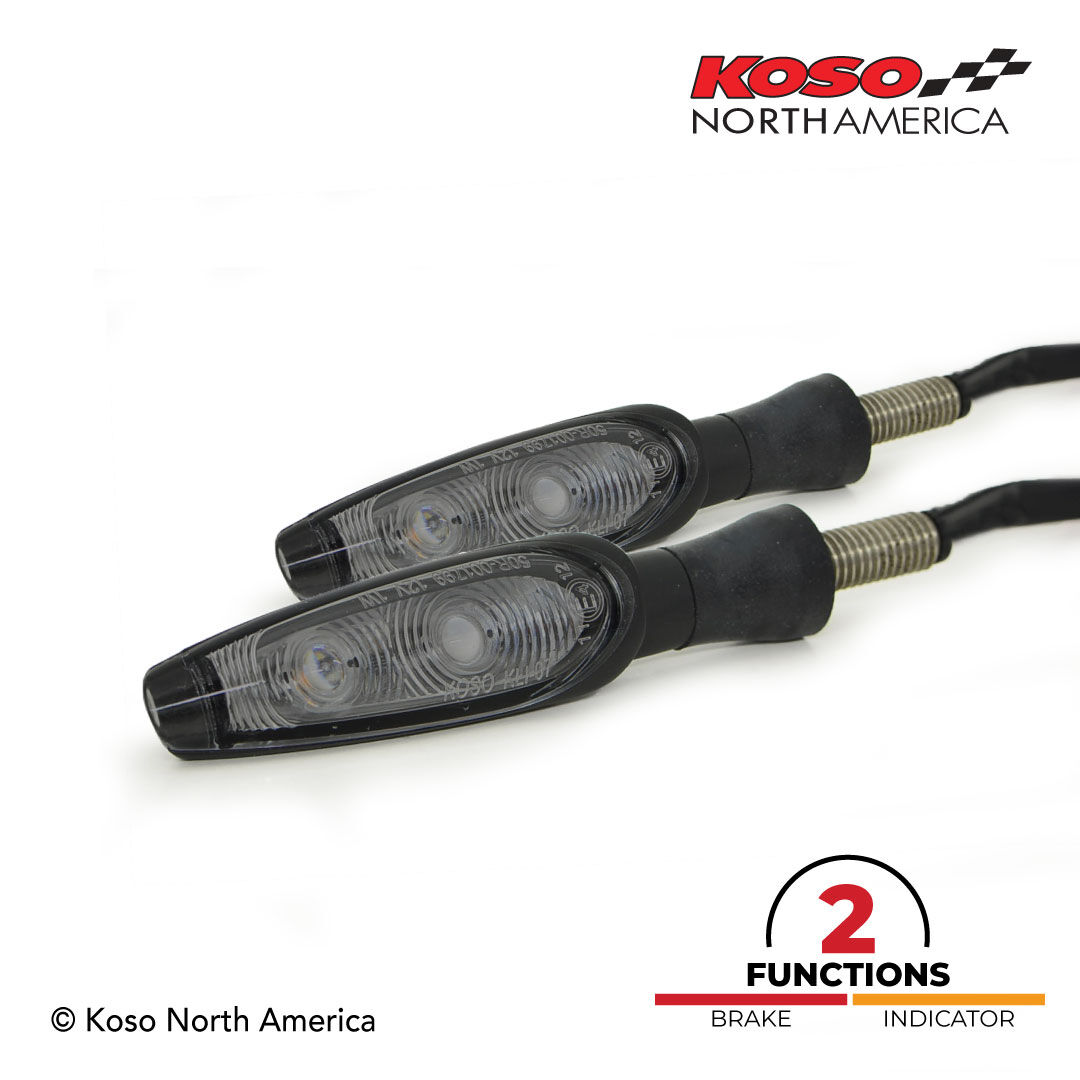 BRAND: Koso SKU: HB030011-WKoso Infinity LED indicator lights are available in 2 models. The DUAL function is a brake light & indicator light. It is used for the rear end; the other is a SINGLE indicator light function for the front end. They are built with 2 ultra‑bright LED, one is RED as the brake light and the other is AMBER as the indicator light. Having a hi‑power LED brake light into the indicator light will increase the visibility of the motorcycle and make it easier to see for other drivers. The Infinity dual hi‑power LED are not only a matter of look... but also a matter of safety.