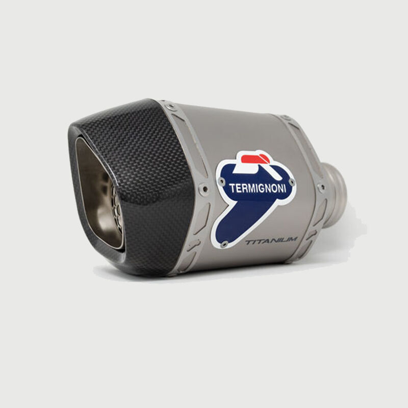 Supported vehicles: KTM DUKE 390 2017-2019 KT18094SO04 Kit Includes: Relevance D70 Titanium Silencer Kit with Carbon Endcap with Stainless Steel Link pipe Features: - Sleeve Material: Titanium - EndCap Material: Carbon - Riveted Clamps - Riveted Logo A Termignoni silencer (or "Termignoni muffler") is a high-performance aftermarket exhaust component typically used on motorcycles, designed to enhance the bike's sound, performance, and aesthetic appeal. Termignoni is an Italian brand renowned for its high-quality exhaust systems, and their silencers are often featured in racing and performance applications.