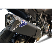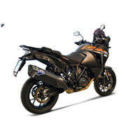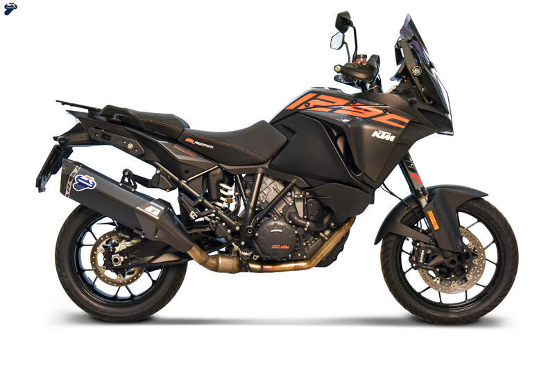 Termignoni presents a type-approved muffler dedicated to the KTM 1290 SUPER ADVENTURE CODE: KT1908040IBC Technical Specifications: The muffler, made of stainless steel, has the following features: – Gray-painted stainless steel sleeve – Carbon fiber end cap – Carbon fiber heat shield – Riveted metal historic logo. - OEM EXHAUST WEIGHT: 6.6 kg - TERMIGNONI EXHAUST WEIGHT: 5.5 kg Weight difference compared to OEM: 1 kg * The weight includes the heat shield and mounting bracket Weight difference compared to OEM -1.1 kg POWER [hp], Delta vs. OEM MAX Gain 2.5 hp @ 8750 rpm Pmax 0.89 hp @ 9250 rpm TORQUE [Nm], Delta vs. OEM Max Gain 4.3 Nm @ 3500 rpm Cmax 1.77 Nm @ 7000 rpm MATERIAL MATERIAL Titanium, Carbon