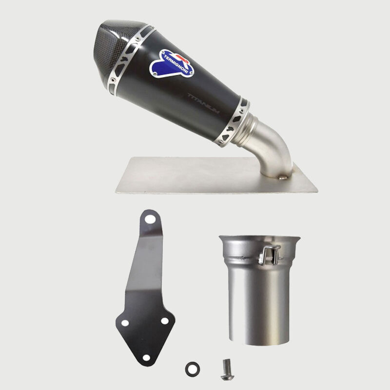 Supported vehicles: KTM SUPER DUKE 1290 R 2017-2019 KT22094SO09 Kit Includes: Relevance Conical Black Titanium Silencer Kit with Carbon Endcap with Stainless Steel Link pipe Features: - EndCap Material: Carbon - Sleeve Material: Titanium Painted Black - Riveted Clamps - Riveted Logo - With Db-Killer A Termignoni silencer (or "Termignoni muffler") is a high-performance aftermarket exhaust component typically used on motorcycles, designed to enhance the bike's sound, performance, and aesthetic appeal. Termignoni is an Italian brand renowned for its high-quality exhaust systems, and their silencers are often featured in racing and performance applications.