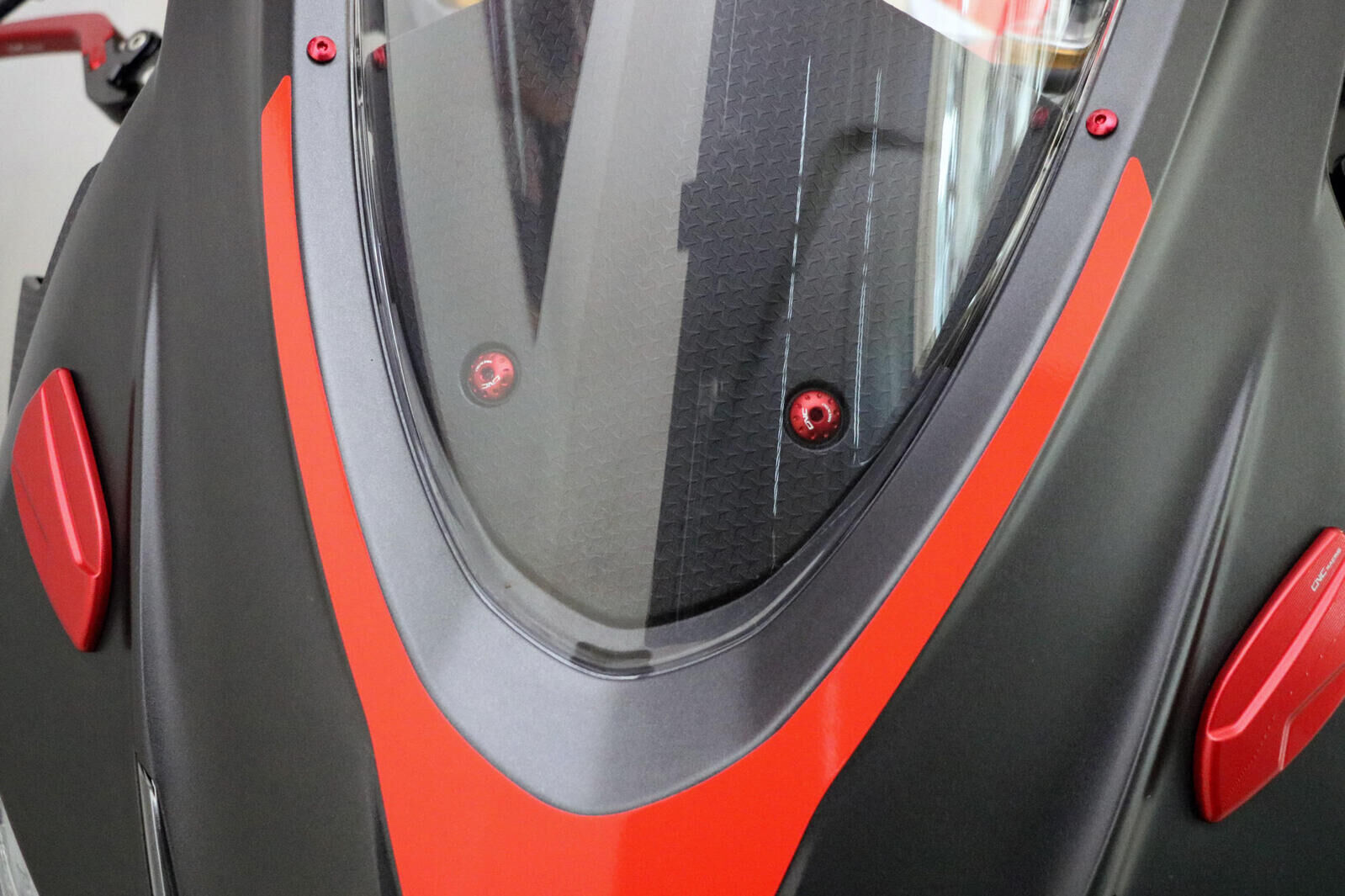 Screws kit for the dashboard cover of the Aprialia RS 660 made in light alloy, machined from solid and then anodized.Kit consists of 2 screws. Please check Specifications for model compatibility.Delivery note: At Sportsbike, we offer a wide range of high-quality products, many of which are sourced directly from Europe. We have stock both in Australia and shipped in directly from Europe. Therefore, please allow 1-3 weeks for delivery. This ensures we can provide the best selection and service for your specific needs. We will confirm the ETA of shipping within 24-48 hours of an order being placed. Thank you for your understanding and patience!